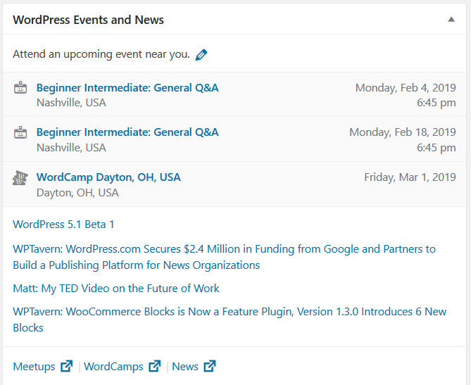 Moderators on WordPress sites (there are more than 75 million of them — somewhere around 30% of the web) like this one also have access to something called a Dashboard, which (when it works correctly anyway) puts all of the moderating tools within reach. The dashboard has a small link back to the WordPress mothership, so WordPress can keep mods posted on upcoming events. Here’s what mine looks like: