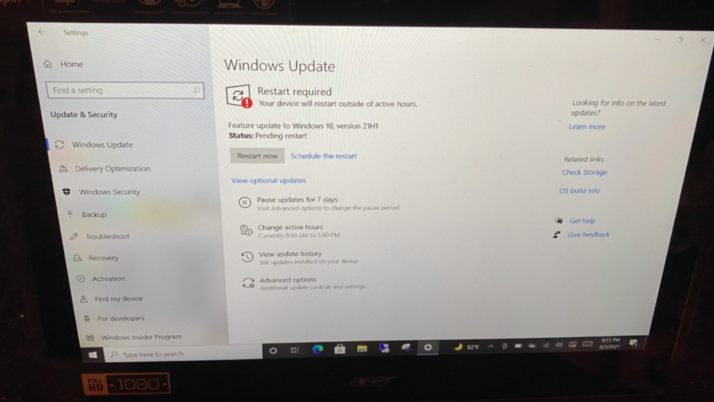 This is my ancient Acer 32 gig hard drive – never should have been sold with Windows 10 in the first place – laptop that I hadn’t paid attention to in ages. I woke it up from sleep tonight because I was straightening up the room where it is and when I went into the windows update section … I just about fell out of my chair. 21H1 was there pending and ready to reboot.